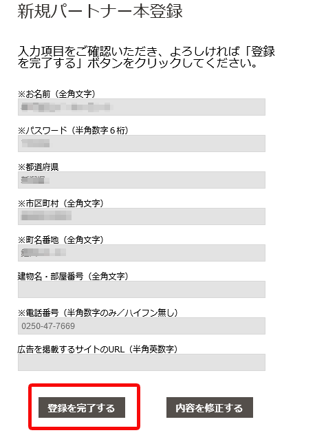 最後に確認画面が出ますので、問題なければ「登録を完了する」ボタンをクリックします。