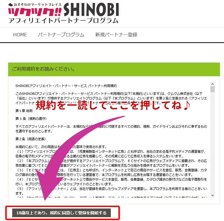 登録したメールアドレスに確認メールが届いているはずですし、上の「SHINOBIパートナーページへ移動する」ボタンをクリックしても進めます。